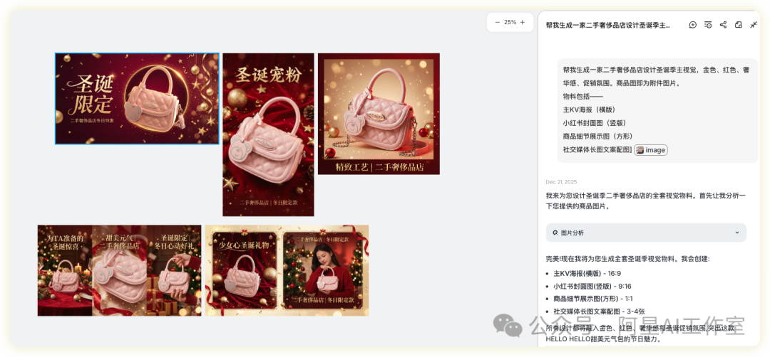 70 后前辈们确实太需要好的 AI 工具啦,所以我推荐她用能直接办事的 AI 来做物料,比如现在流行的圣诞拆解💥视频,法拉利瞬间变漂浮元素,姐姐的包包产品也可以直接漂浮起来~