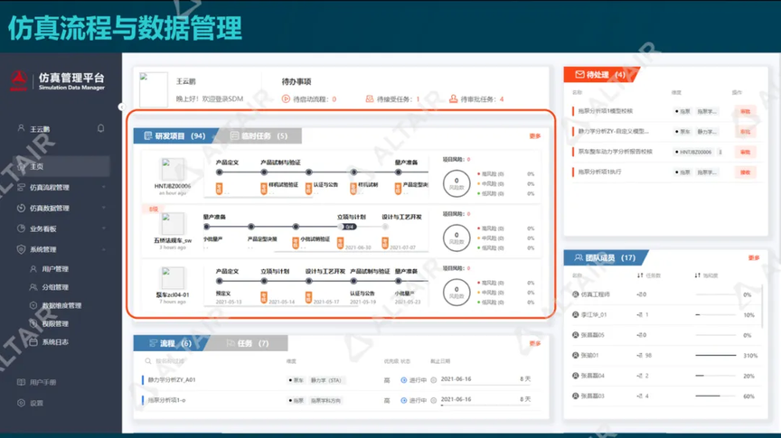 前面主要是站在仿真的技术角度看,下面我们从仿真管理角度看,仿真体系建设离不开仿真流程管理和数据管理,也就是 SPDM。在此我们非常感谢 Altair,从 2021 年开始在三一持续开展仿真数据管理平台建设。三一仿真人员散在各个事业部、仿真学科比较多、产品线也非常宽,如果没有这样一个平台去管理,整个仿真工作就全部被碎片化了,仿真知识也很难重用。所以这几年在仿真管理上我们主要开展了 SPDM 系统的建设。这个系统不是个孤立的系统,它打通了设计平台、试验平台,能够让我们从设计、仿真到试验形成较为完整的产品验证闭环,设计、仿真和试验全部在线化,流程数据全部打通,对整个管理效能提升的帮助非常大。