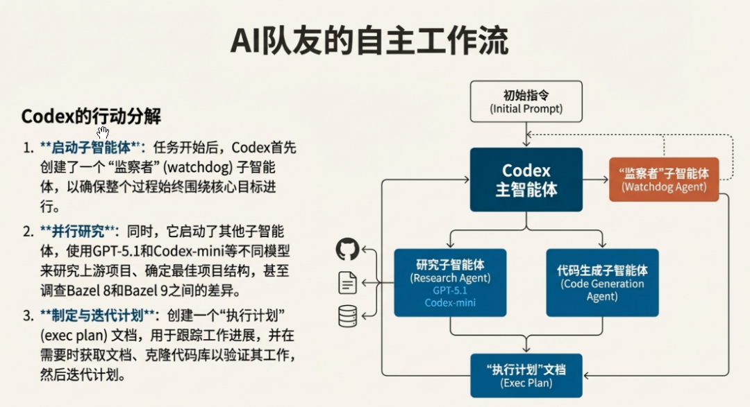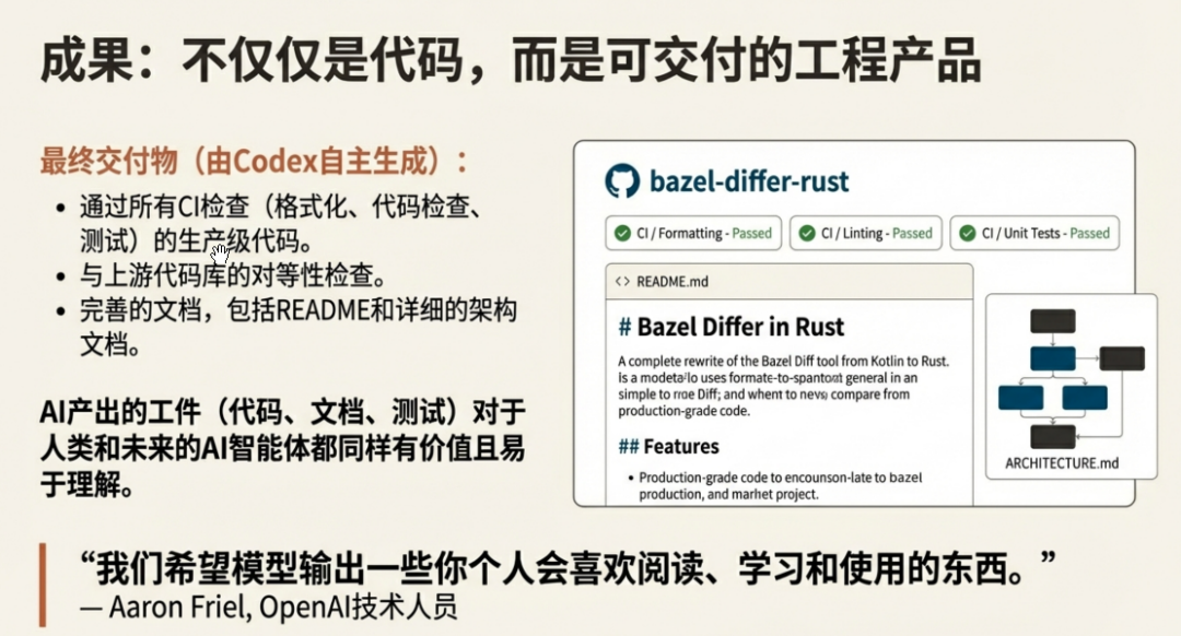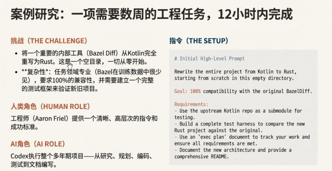 在现场演示中,OpenAI 的工程师 Aaron Friel 展示了一个惊人的案例:让 AI 智能体将一个完整的项目从 Kotlin 语言重写为 Rust 语言。这项任务从零开始,AI 在一夜之间工作了 12 个小时便告完成 。同样的工作,对于一名人类工程师来说,可能需要数周时间来构建和验证 。