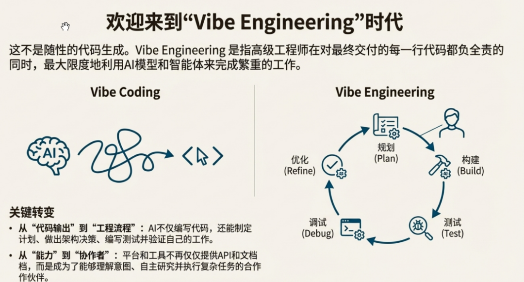 过去,我们谈论的是“Vibe Coding”(氛围编码),即 AI 根据模糊指令生成代码片段。现在,我们进入了“Vibe Engineering”(氛围工程)的时代,AI 已经成为贯穿整个开发生命周期的合作伙伴。