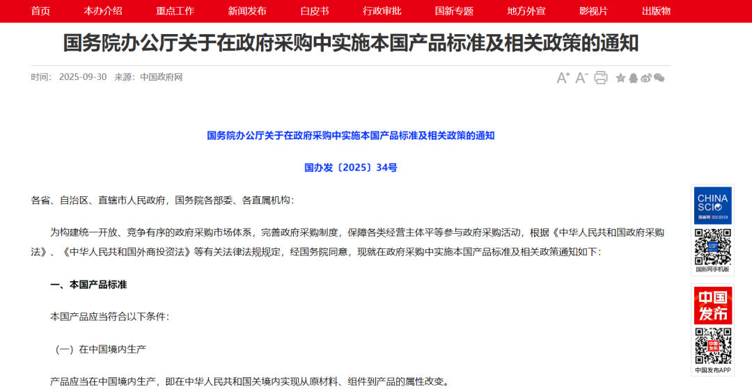 其实在“软件封锁阴影 ” 笼罩之前,国务院办公厅已印发《关于在政府采购中实施本国产品标准及相关政策的通知》,自 2026 年 1 月 1 日起施行。
