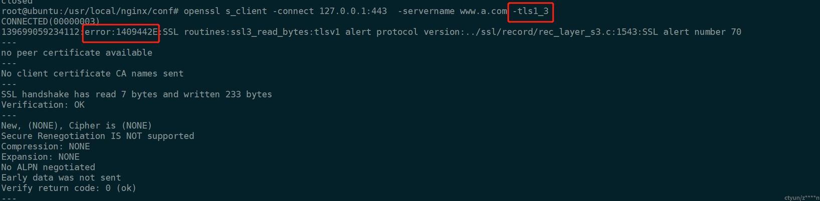 使用 tls1.3 连接 www.a.com 不可以实现 openssl s_client -connect 127.0.0.1:443 -servername www.a.com -tls1_3