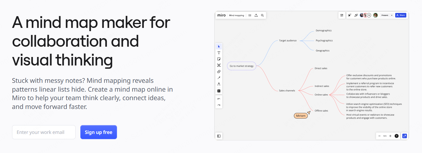 核心优势:极其强大的第三方集成。你可以把 Jira 的卡片、Google Drive 的文档直接丢进 Miro 的导图节点里。