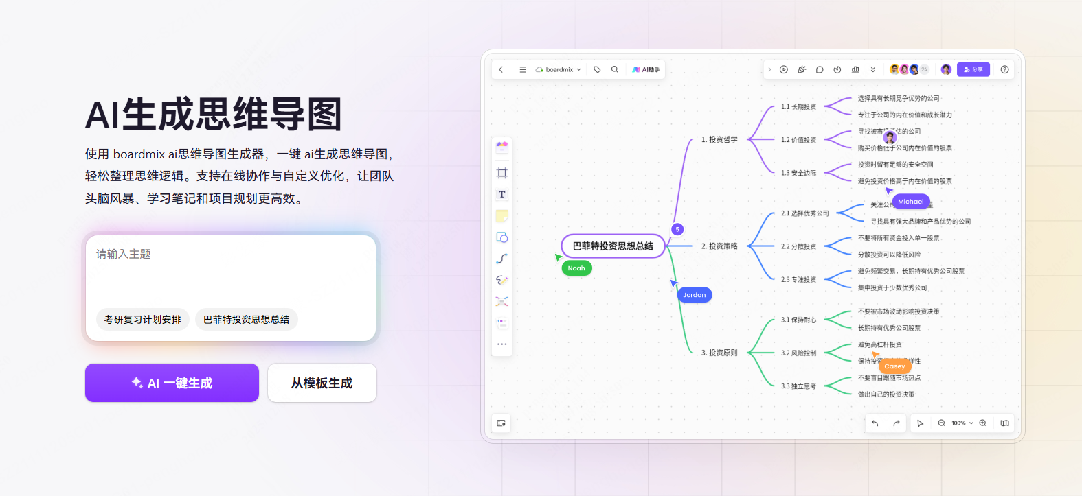 AI 生成思维导图:boardmix 内置 AI 思维导图智能体,支持 AI 一键生成思维导图、AI 提炼 TXT/Word/PDF/Markdown 文档生成思维导图、OCR 识别图片为思维导图、导入文件转换为思维导图,让思维导图绘制效率成倍提升。
