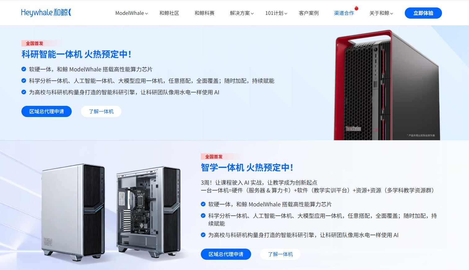 和鲸科技深耕人工智能领域多年,基于智能体技术与 AI 工程化能力双轮驱动,加速 AI 落地,长期助力各行各业实现精准决策与可持续创新。为有效应对教科研场景中面临的算力瓶颈与复杂需求,和鲸连续推出国内首款科学智能一体机及智学一体机。