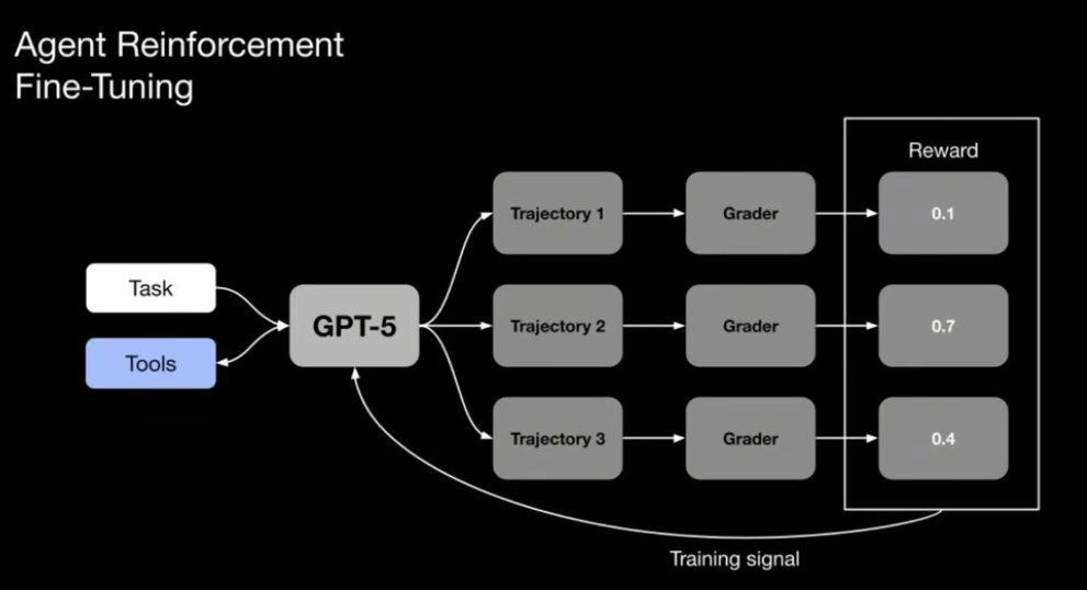当尝试了提示工程、任务优化和工具优化等所有方法后,如果还希望获得更好的性能,微调 (Fine-tuning) 就派上用场了。微调是一种端到端地在任务上训练智能体以实现更高性能的方法。Agent RFT (Agent Reinforcement Finetuning,智能体强化学习微调) 正是为此设计的解决方案。