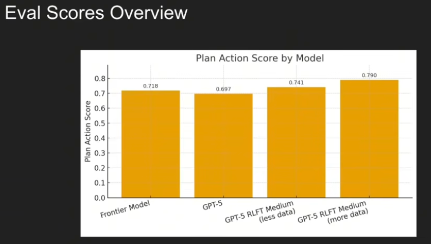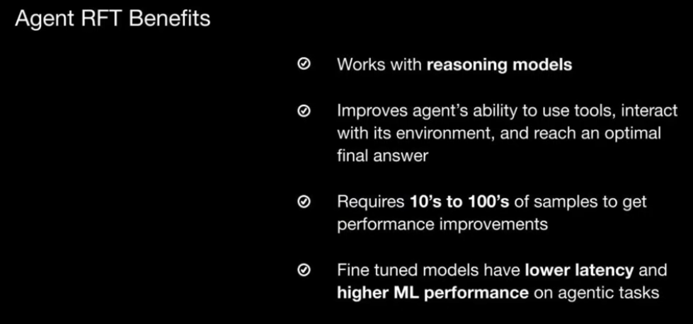 Agent RFT 的核心价值在于,将模型在预训练中形成的世界观与用户特定的业务世界(自定义工具、私有数据)对齐。演示中工具调用次数的急剧下降,正是 RFT 成功教会模型在新环境中如何高效行动的证明。