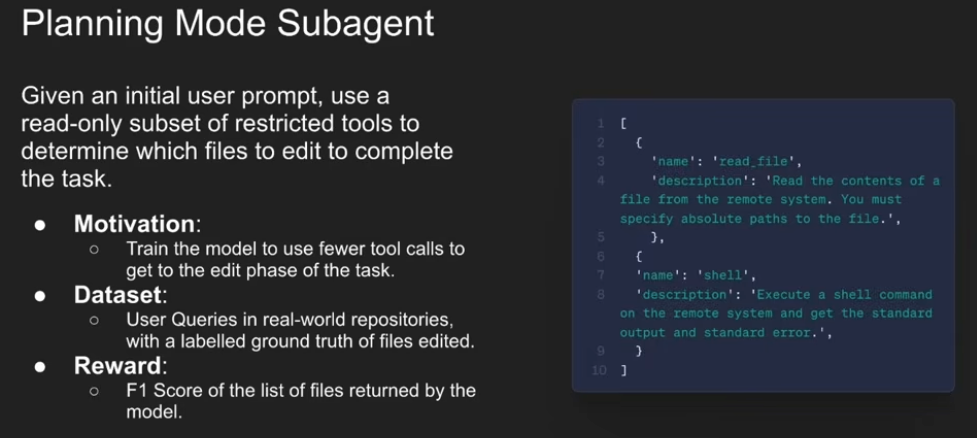 他们的目标是微调 GPT-5,使其能更快地进入代码编辑阶段,同时保持甚至提高准确性。在任务设计上,他们限制了智能体在规划阶段可用的工具,只允许使用 read file(读文件)和 shell(用于执行 grep 搜索字符串或 find 查找文件等命令),此阶段不允许进行编辑。