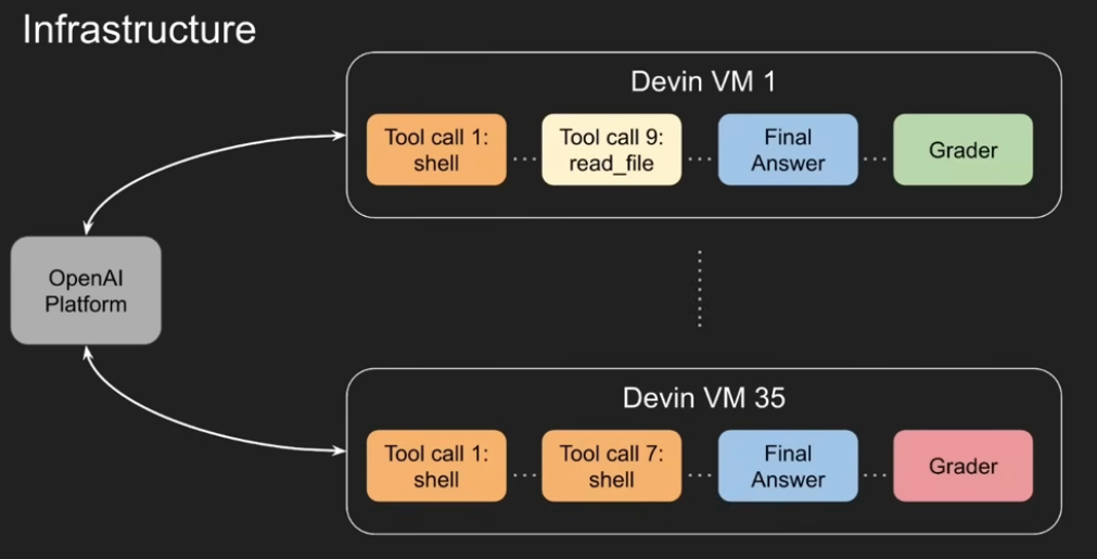 在基础设施方面,Cognition 将工具调用和评分器都作为远程端点运行。在训练的每一步,OpenAI 平台会向他们发送大量部署请求。关键在于,Cognition 为每一次部署 (each rollout) 都启动了一个全新的虚拟机。他们选择使用 VM 是为了实现隔离。因为智能体可以使用 shell 工具,他们不希望一个部署中的破坏性操作(比如模型发疯运行了 rm -rf)影响到其他部署。
