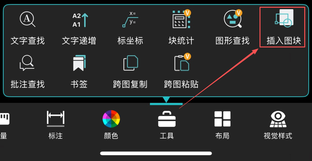 1、打开浩辰 CAD 看图王 APP,点击工具箱里面的【插入图块】功能;