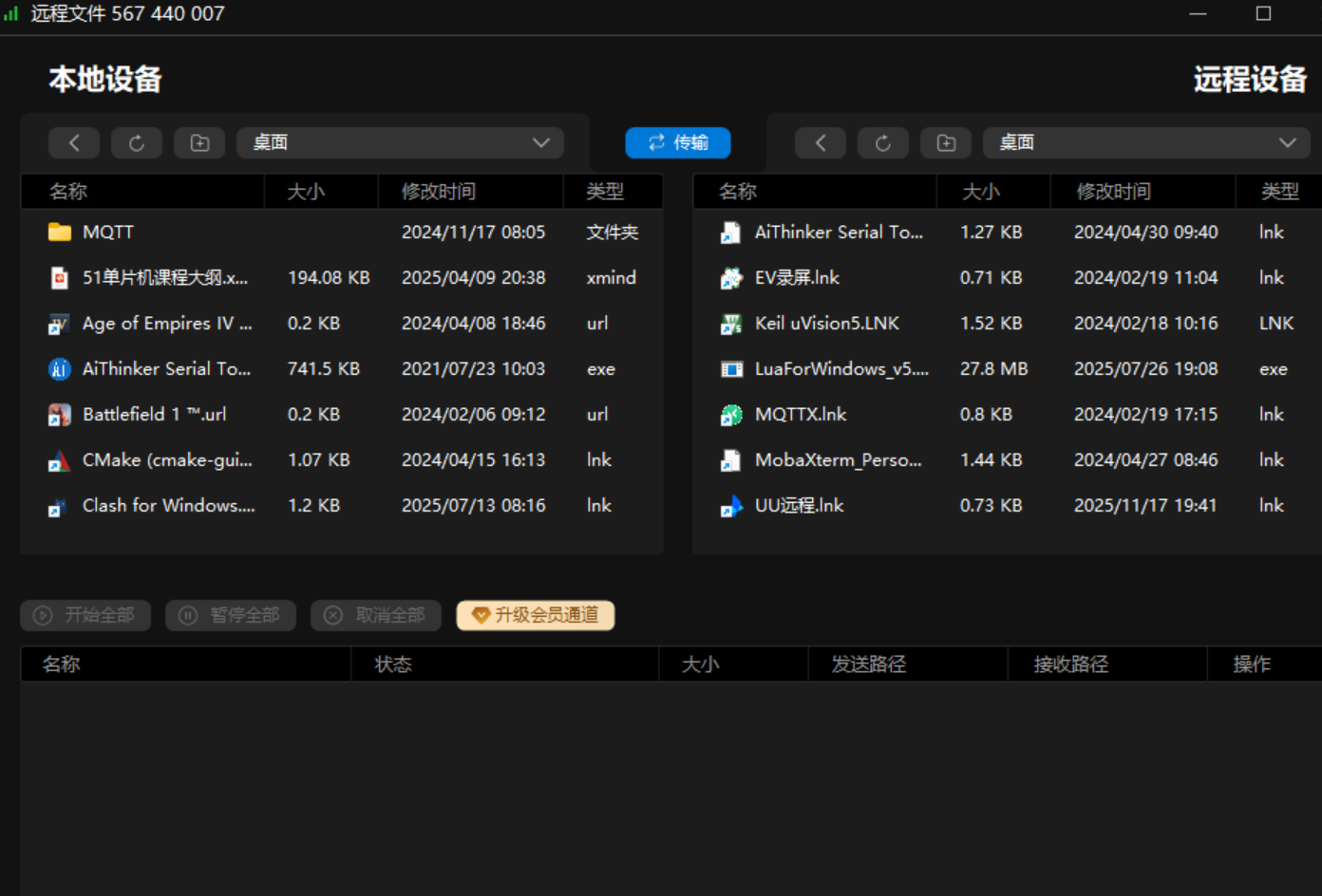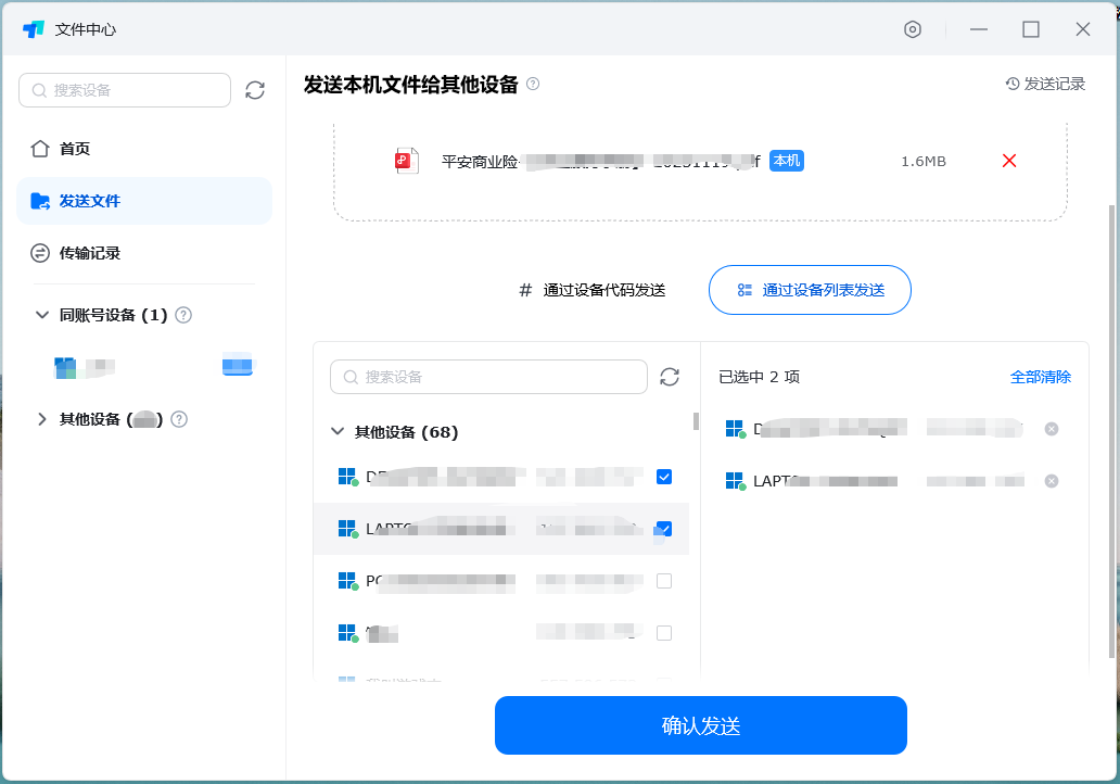 而 ToDesk 文件不仅仅是一传一,还可以直接“一传五”,就在客户端的【文件中心】功能项目中,可以识别本机设备情况,拖拽或选择文件传给同账号的设备(支持最高一次性传送 5 台设备),非常好用又便捷!同时还有发送记录可随时查询发送对象、状态等等。