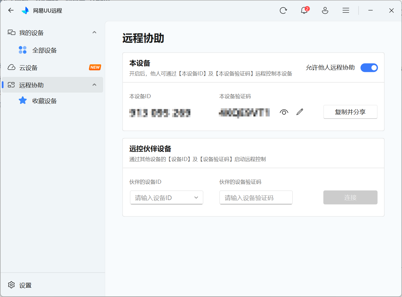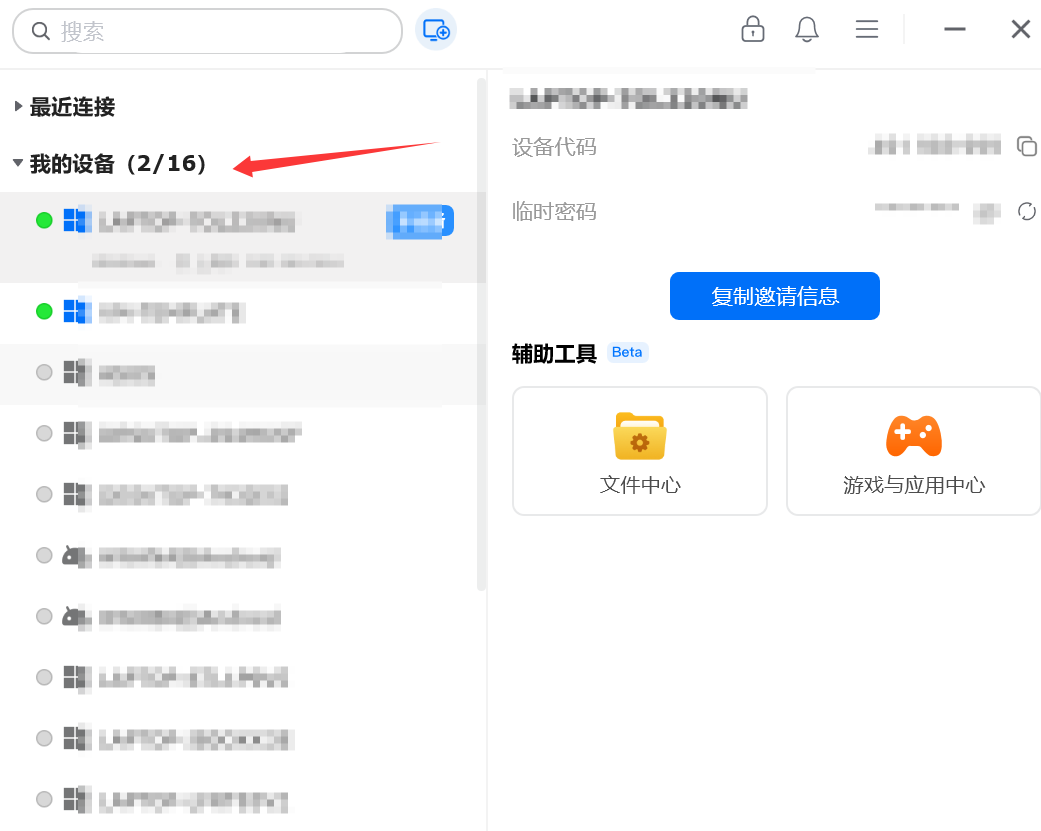 ToDesk 界面清新简洁,进入后就直接可以看见设备代码和控制密码,对于新人来说是非常直观的。