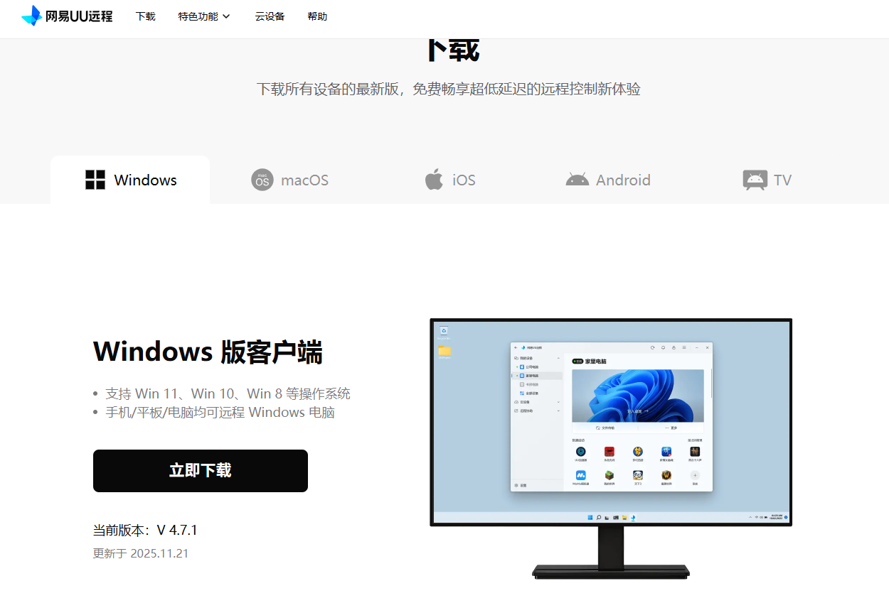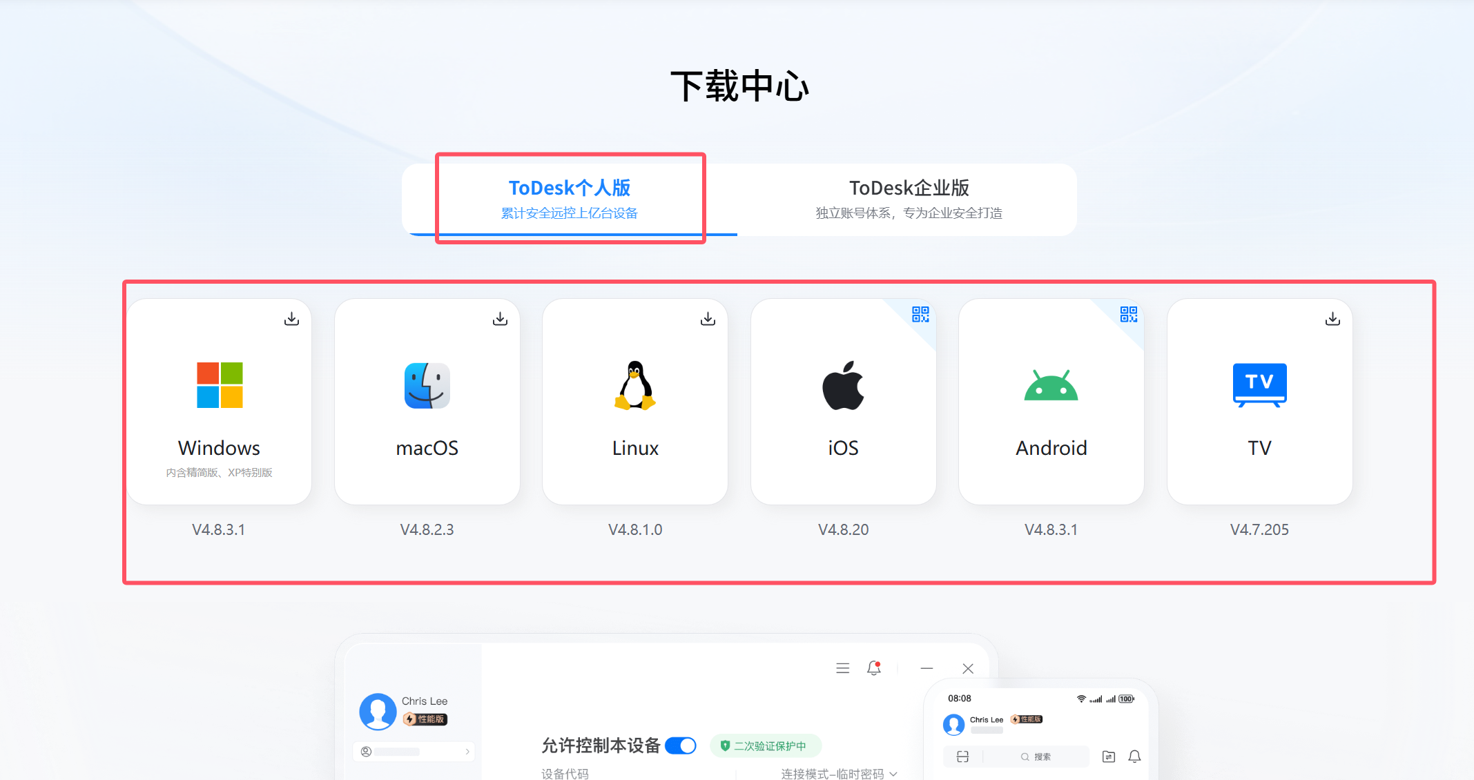 可以看到 ToDesk 兼容性非常强,支持 Windows、Android、Linux、iOS、macOS 等主流操作系统,同时也提供了 Windows XP 系统和精简版(免安装)。