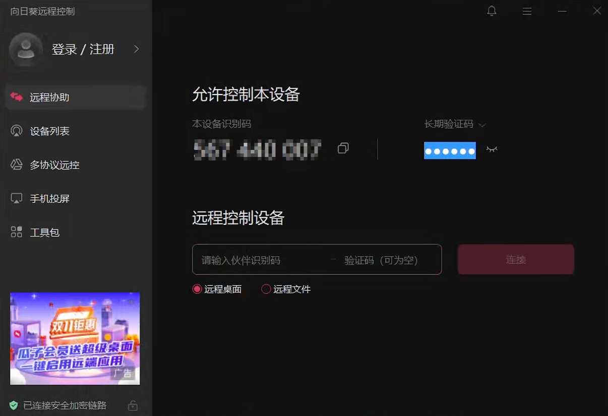 向日葵的话进入后也是可以看见设备识别码的,但是无法直接看到密码,需要用户手动去点击才能查看,这样的话会麻烦一些。