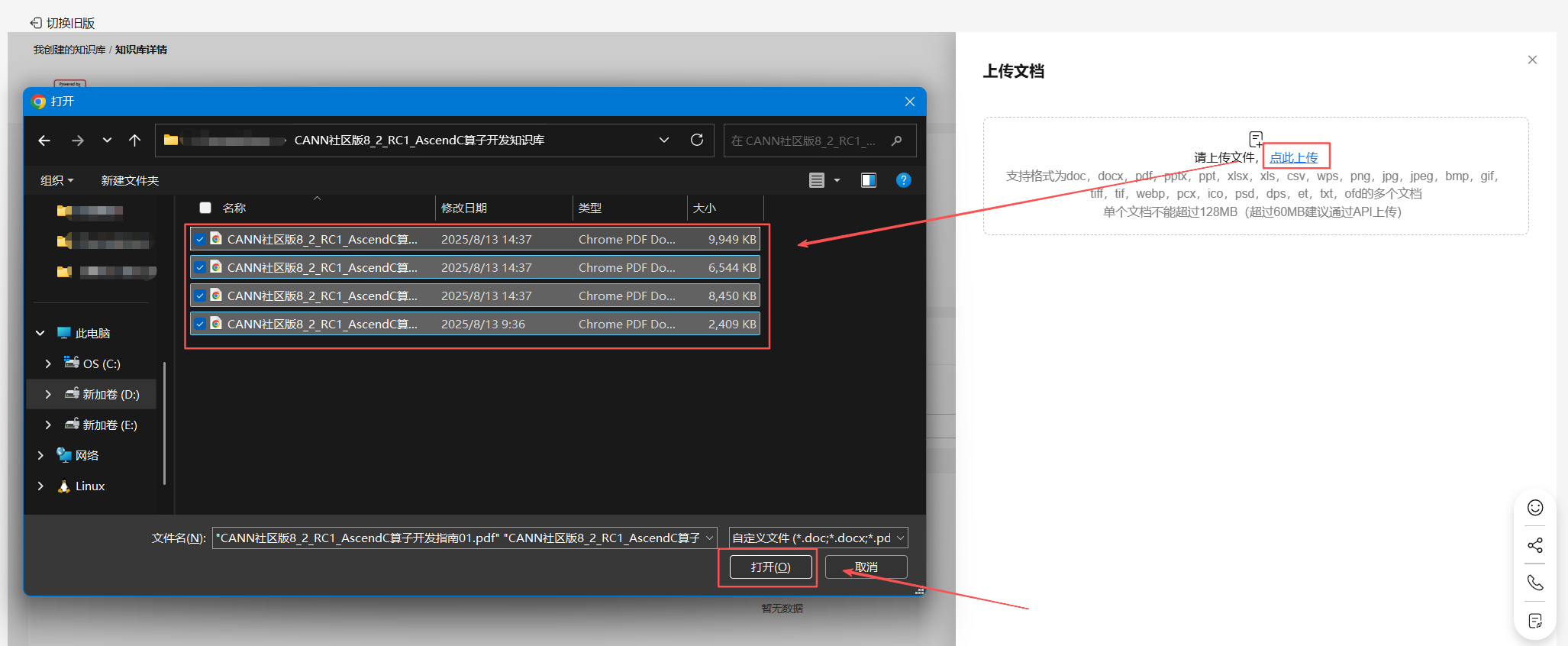 在右侧弹出的上传文档抽屉中点点此上传,选中准备好的 PDF 文件,点打开。