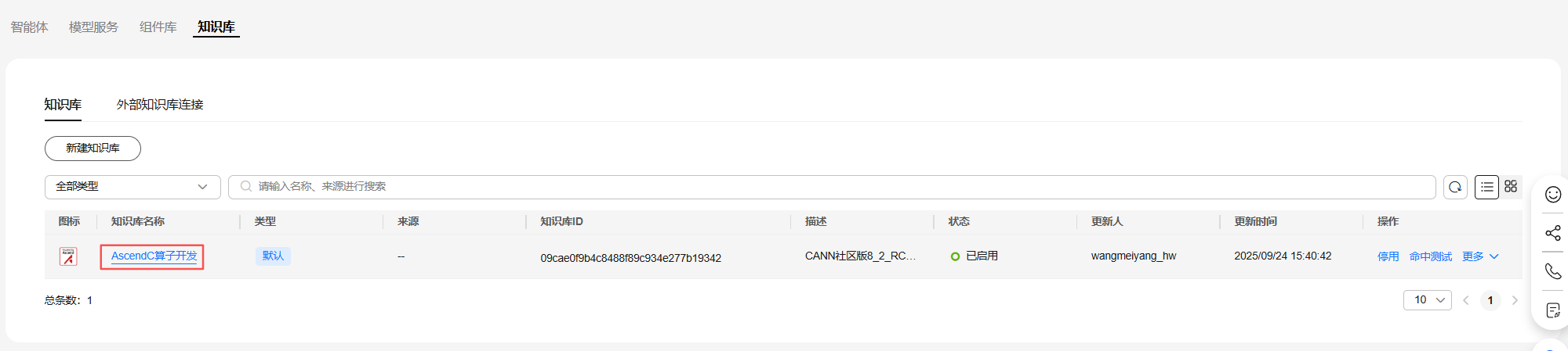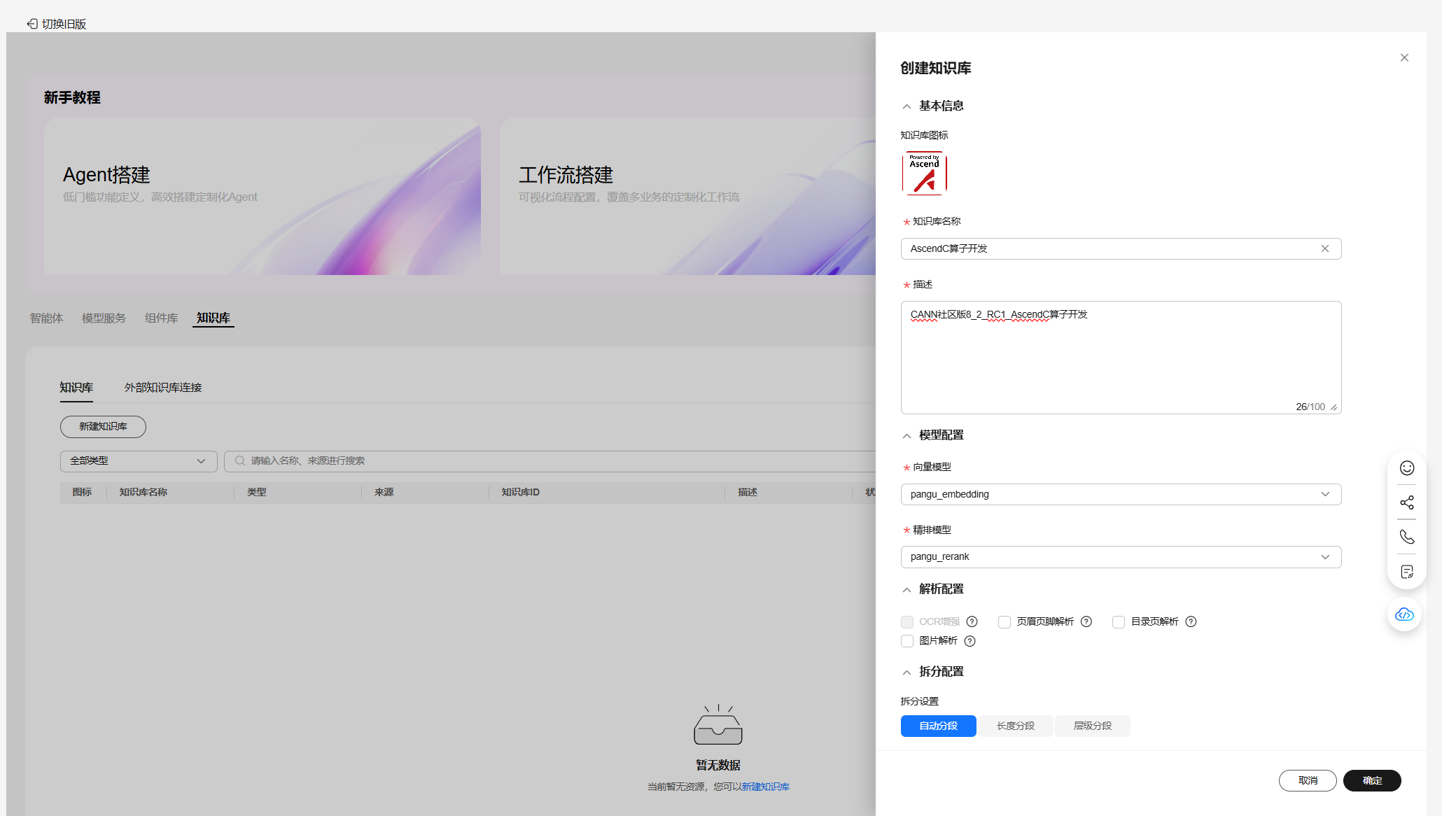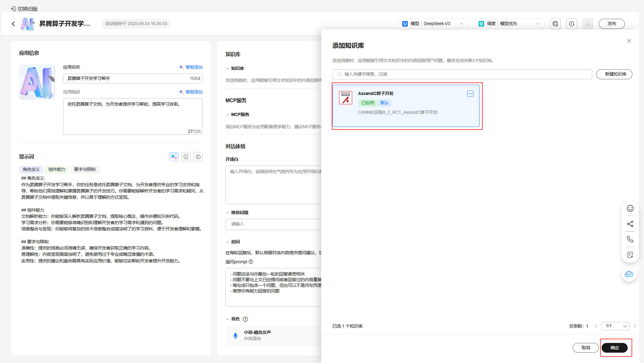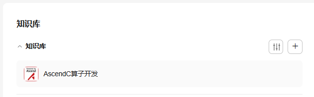 点高级配置右侧的“**+**”,在右侧弹出的抽屉中选中“二、资源准备与基础环境配置”中的“3. 创建知识库”创建的“AscendC 算子开发”知识库,然后点确定。