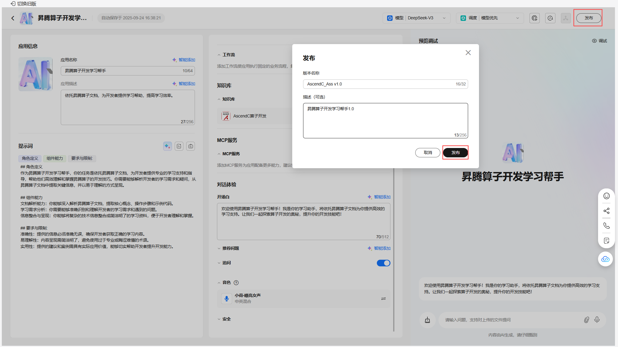 点右上角的发布,在发布弹窗中输入版本名称:AscendC_Ass v1.0,描述:昇腾算子开发学习帮手1.0