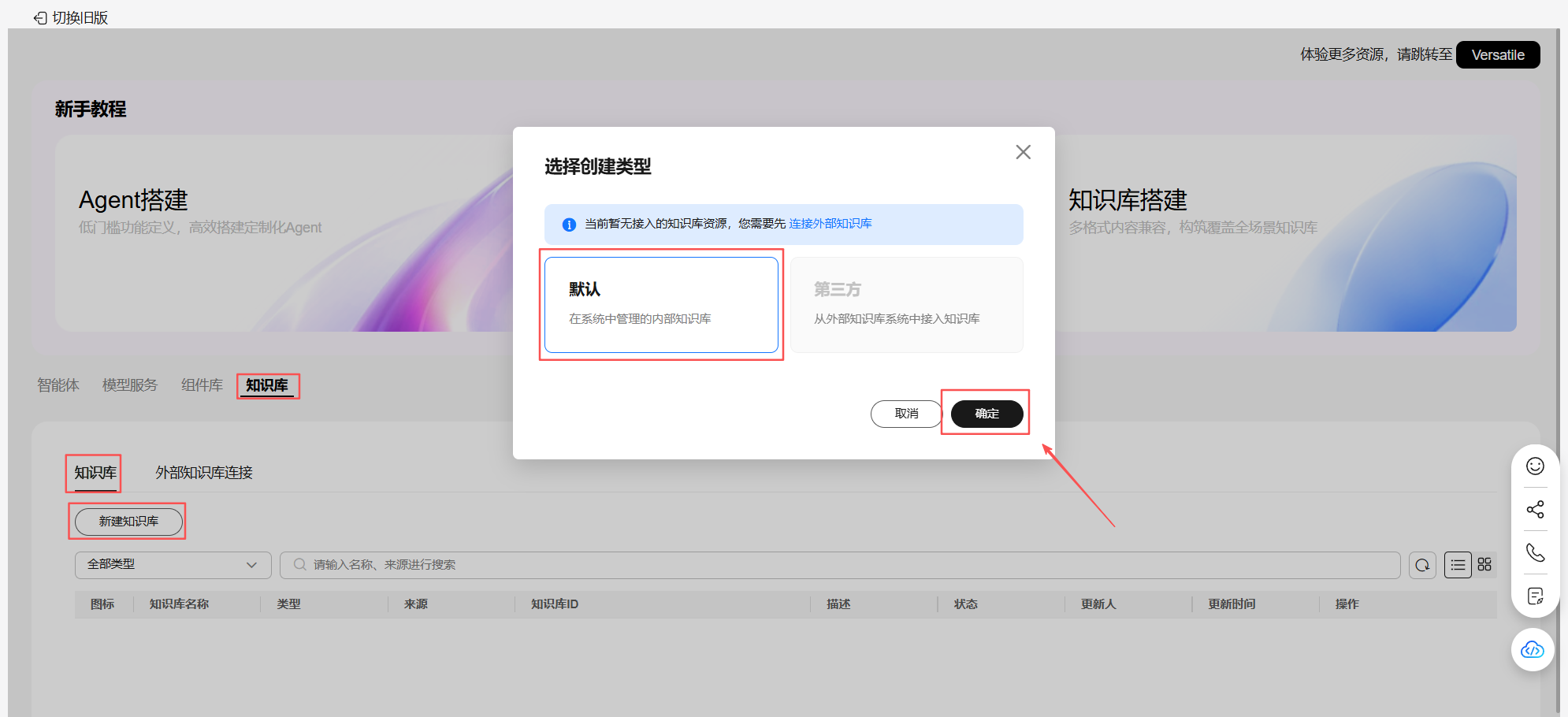 本案例中需要使用自有知识库功能,构建昇腾 C 算子开发知识库。在 Versatile Agent 平台选择知识库 > 知识库,点新建知识库,选择默认,然后点确定。