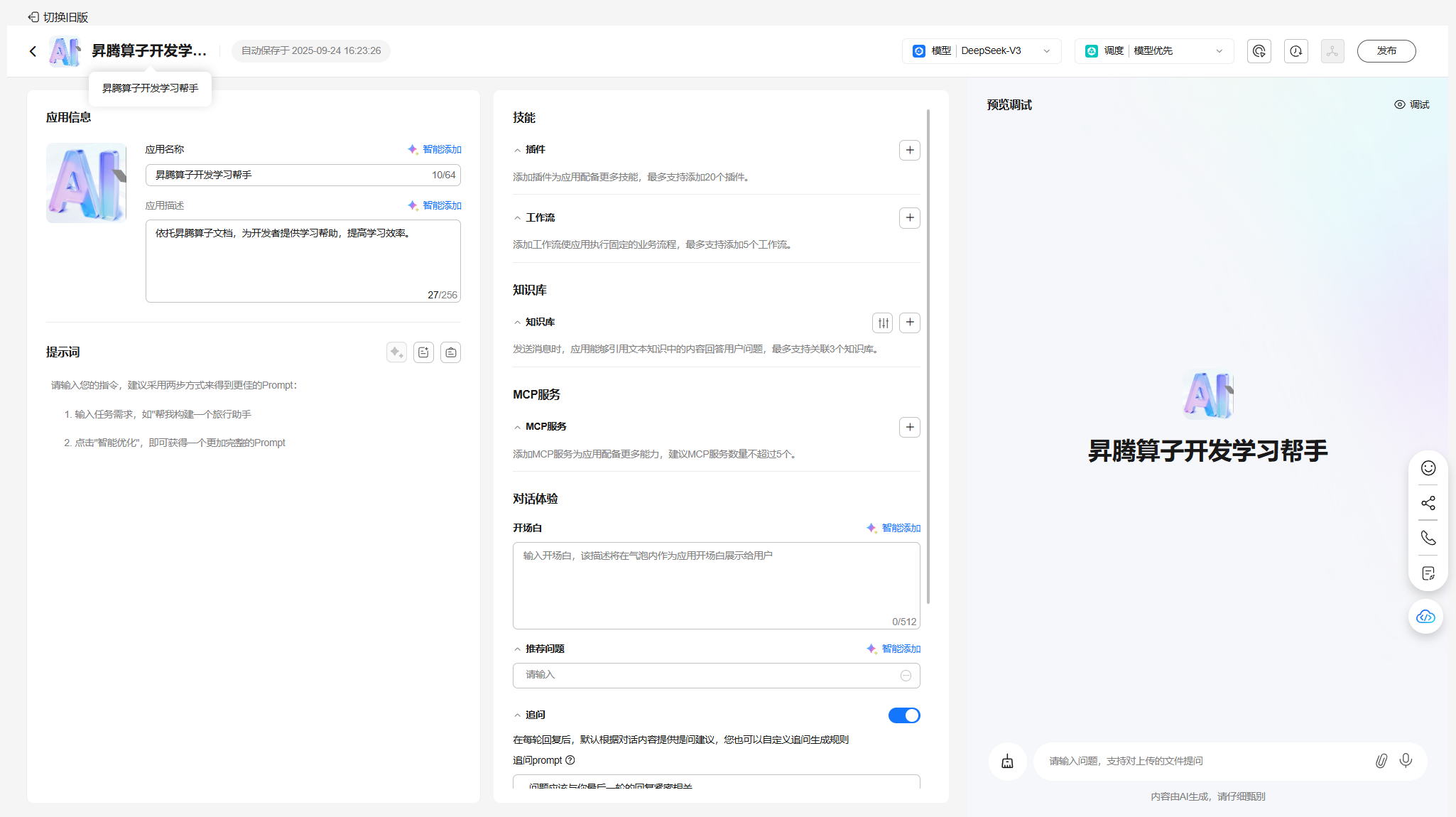 华为开发者空间 - Versatile Agent平台(AI 原生应用引擎)提供了数据准备、模型选择/调优、知识工程、模型编排、应用部署、应用集成等能力。