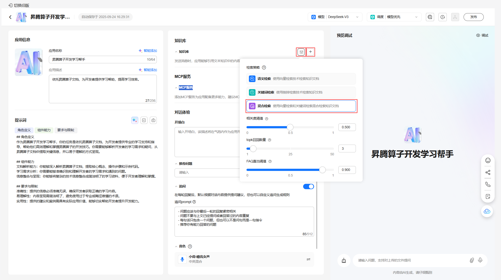 模型选择可以选择平台预置的 DeepSeek,也可以选择前面“二、资源准备与基础环境配置”章中的“2. 配置模型”节配置的 MaaS 模型资源。为了保证应用的运行不受资源限制影响,这里选择 ModelArts Studio(MaaS)模型服务中的 DeepSeek-V3-64K。