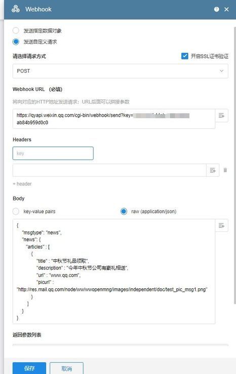 设置执行动作,同样要用到 Webhook 链接。这次的配置方式和推送文本消息类似,先把示例代码复制粘贴过来,测试 Webhook 节点有效性后,再把内容换成表单的字段值。