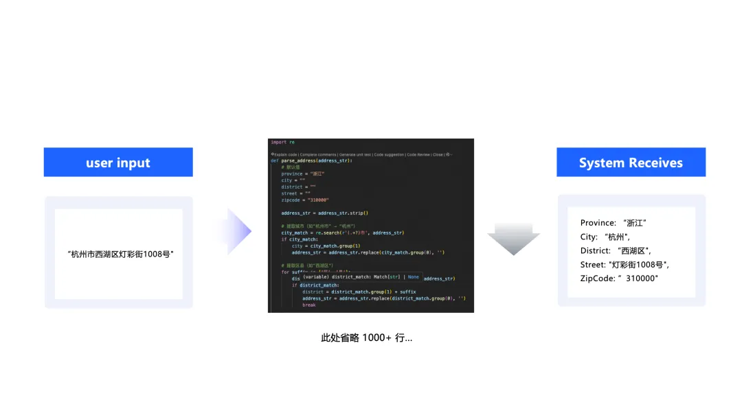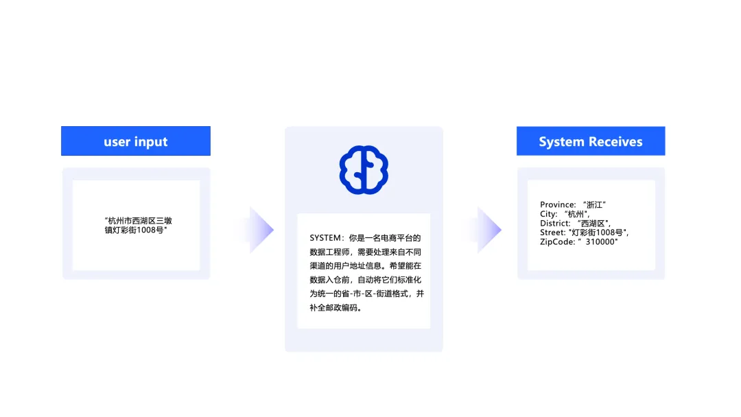 以一个常见的地址信息标准化场景为例。用户输入的地址格式五花八门,可能是文本、文档、扫描图片以及客服对话等。后端系统为了便于入库与分析,必须将这些信息精准地解析为“省-市-区-街道”的标准化结构。更棘手的是,原始地址信息还可能存在错别字、信息缺失或语义模糊等问题。在传统 ETL 模式下,工程师不得不编写数千行复杂的正则表达式和判断逻辑,并维护一个庞大的地址库。这种方式不仅开发和维护成本高、扩展性差,而且难以覆盖所有非标准格式和异常情况。
