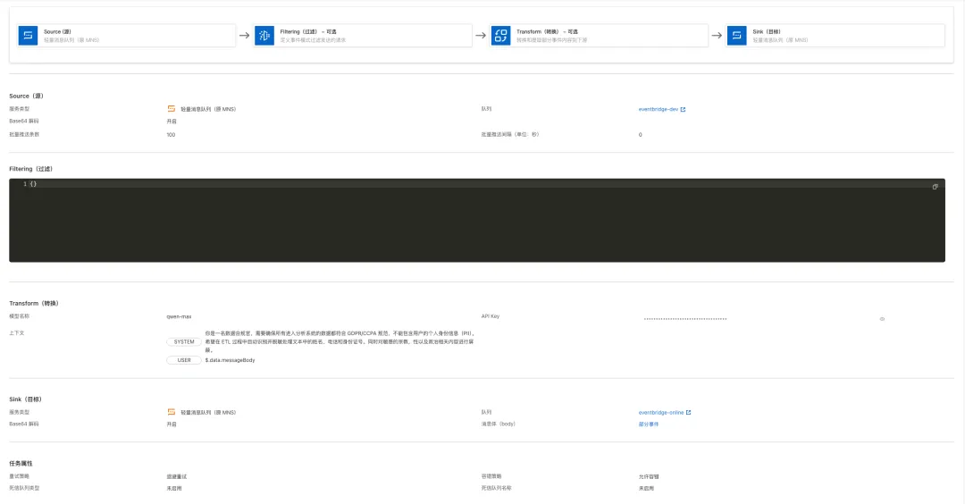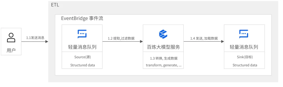 在 ETL 的 “转换(Transform)” 环节中,EventBridge 允许用户直接调用大语言模型(例如通义千问或百炼大模型服务平台上的模型),甚至是更复杂的 AI Agent。