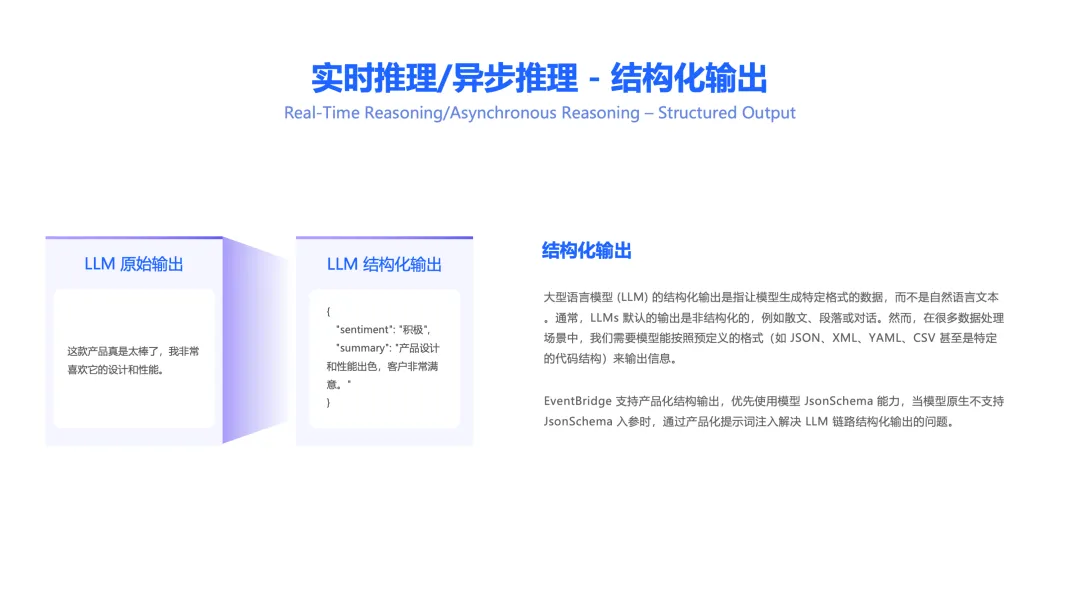 为了解决这个核心痛点,EventBridge 提供了强大的结构化输出(Structured Output) 能力,确保 AI 的每一次处理结果都以稳定、可靠的格式返回。