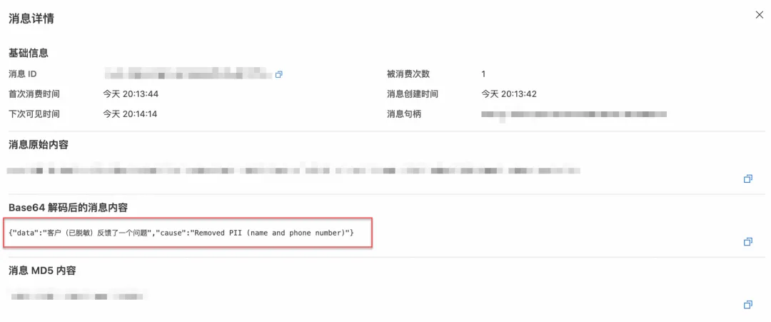 部署完成后,可以通过以下方式验证数据脱敏效果:从 Source(源)队列发送带有敏感信息的数据,然后在 Sink(目标)队列接收经过事件流处理后的数据。