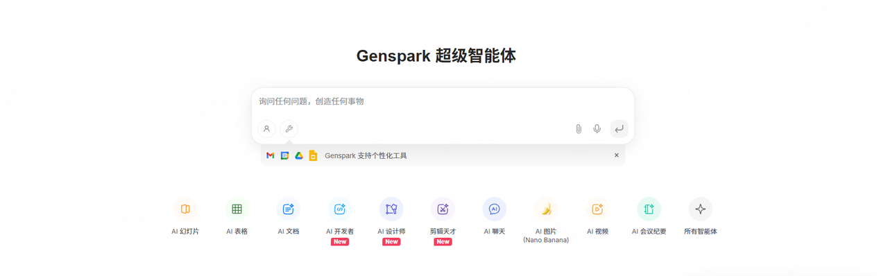 与前面介绍的博思 AI 类似,Genspark 是一个一体化的 AI 工作空间(All-in-One AI Workspace),汇集了包括内容创作、信息检索、数据分析、任务自动化在内的多种 AI 能力,为用户提供一站式的智能创作工具。