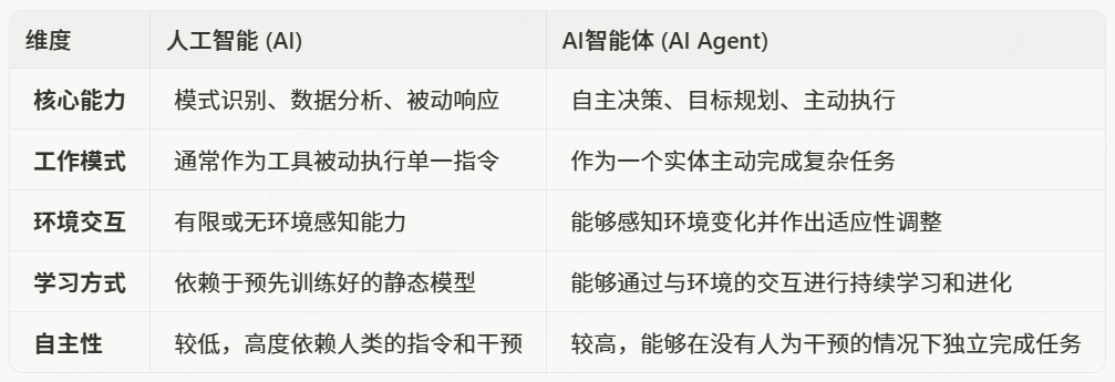 为了更好地理解智能体和 AI 的区别,我们可以从以下几个维度进行对比: