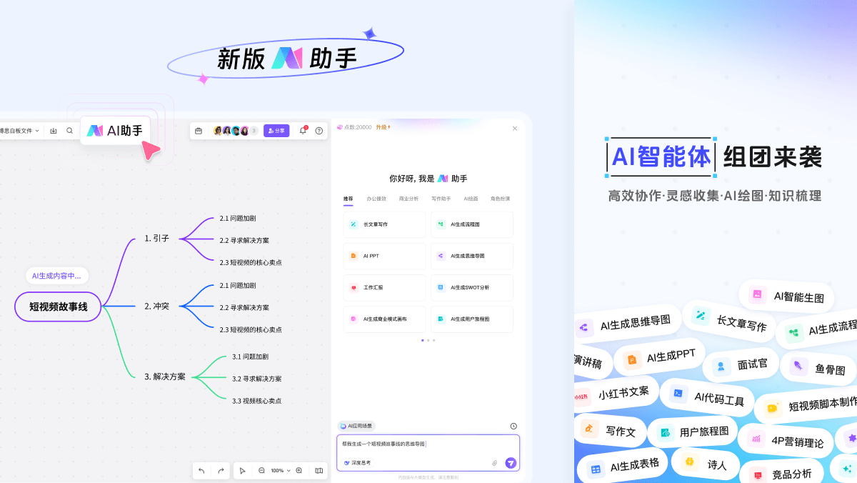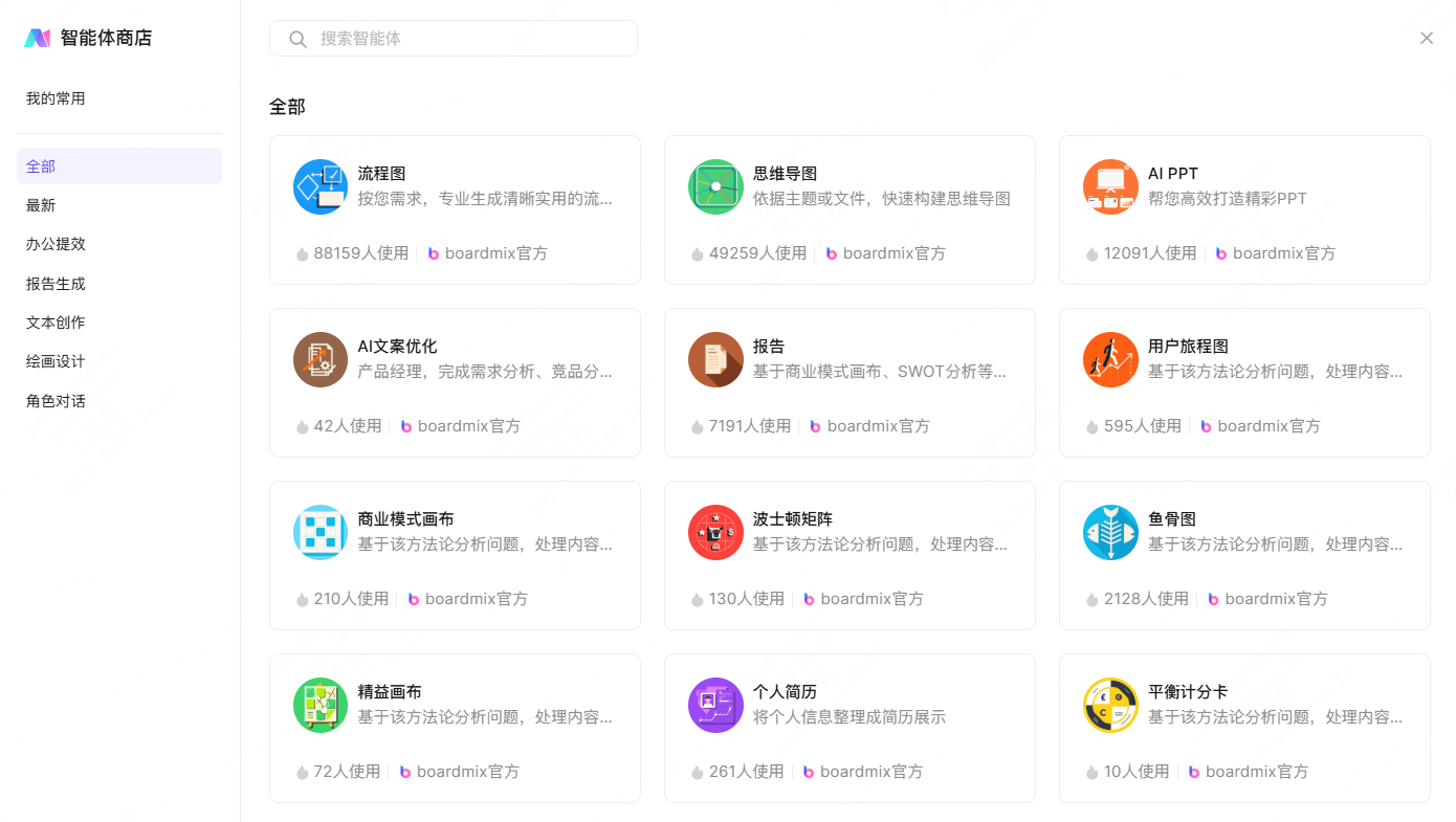博思 AI 智能体将 AI 能力巧妙地集成在 boardmix 博思白板这一在线协作工具中,创造了一种全新的工作模式。boardmix 将 AI 智能体的强大功能与无限延伸的在线画布深度融合,允许用户在一个共享的可视化空间里,通过简单的自然语言指令,调动来自不同领域的多个 AI 智能体协同完成任务。