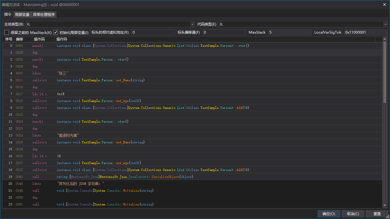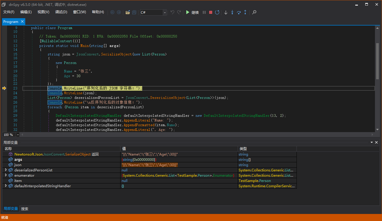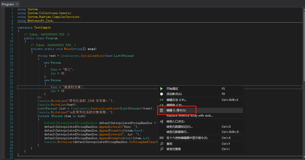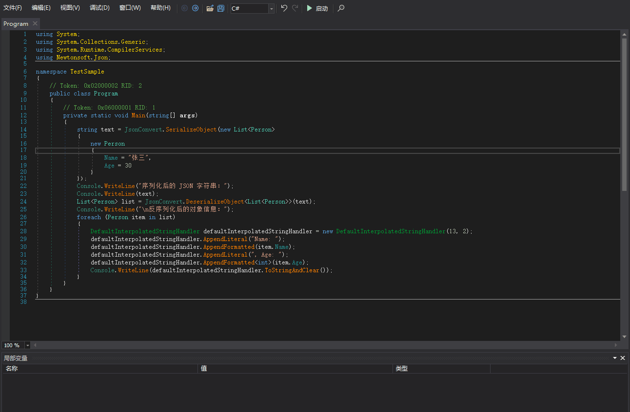 下面我们创建一个名为TestSample的.NET Core 控制台应用,然后写上一段简单的对象序列化和反序列化代码示例。