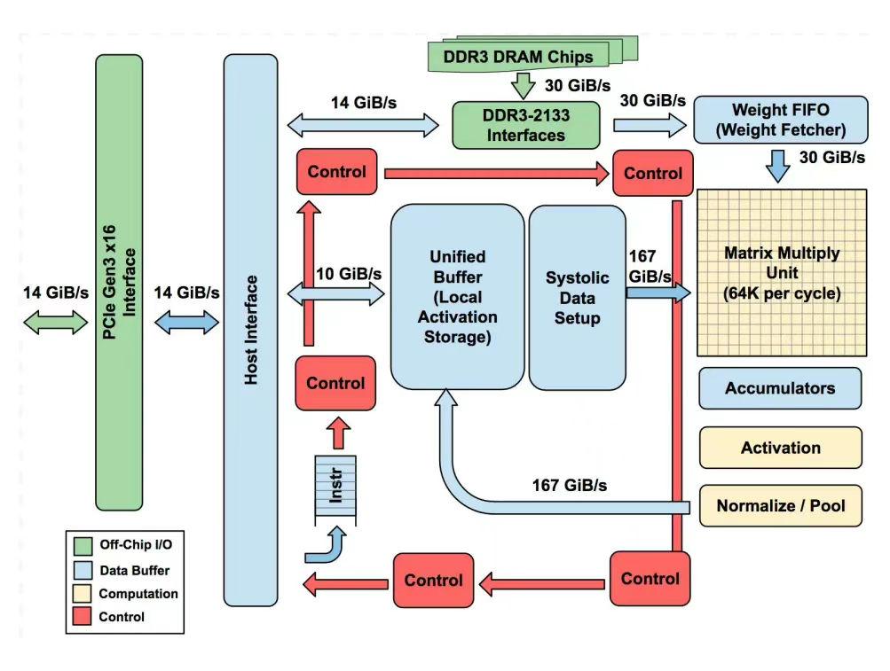 控制逻辑、PCIe 接口和激活单元(用于 ReLU、sigmoid 等函数)为矩阵引擎提供支持,但芯片的大部分面积都用于原始计算和高速数据传输。