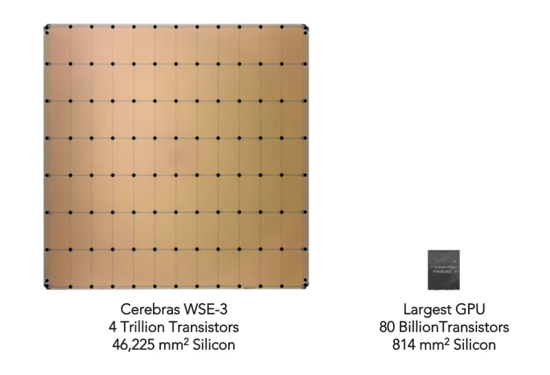 Cerebras 将未来押注于晶圆级芯片。其最新款 Cerebras WSE-3 芯片实际上是史上尺寸最大的 AI 芯片之一 —— 面积高达 46,255 mm²。其核心技术在于:Cerebras 将整片硅晶圆直接制成一颗芯片,而不是像传统 CPU 或 GPU 那样将晶圆切割成数百个小处理器。