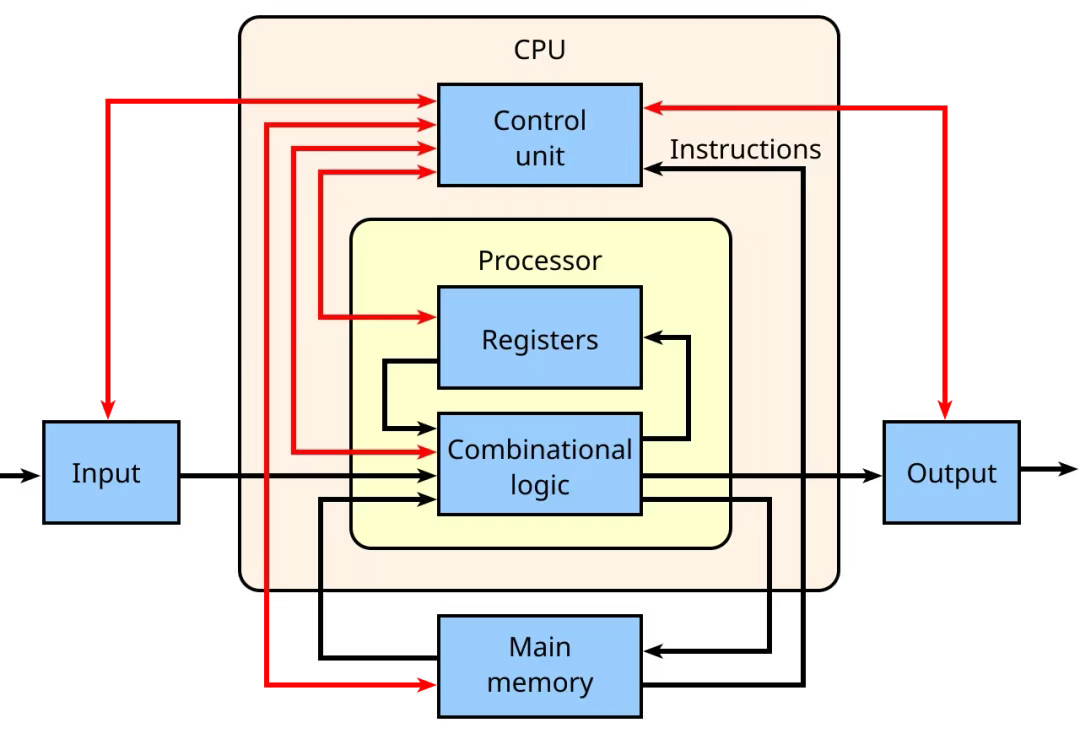 CPU 还包含核心(cores) —— 即 CPU 内部的处理单元,每个核心都能独立处理指令;以及线程(threads),允许一个核心同时处理多条指令流。这些组件都按照时钟信号(clock)的节拍运行,时钟提供了同步整个系统所需的节拍。此外,还有总线(buses,用于数据传输)、指令寄存器(instruction register)和指令指针(instruction pointer,用于追踪下一步要执行的内容)等辅助组件,将整个系统紧密连接,使指令能顺畅地从一个步骤流转到下一个。