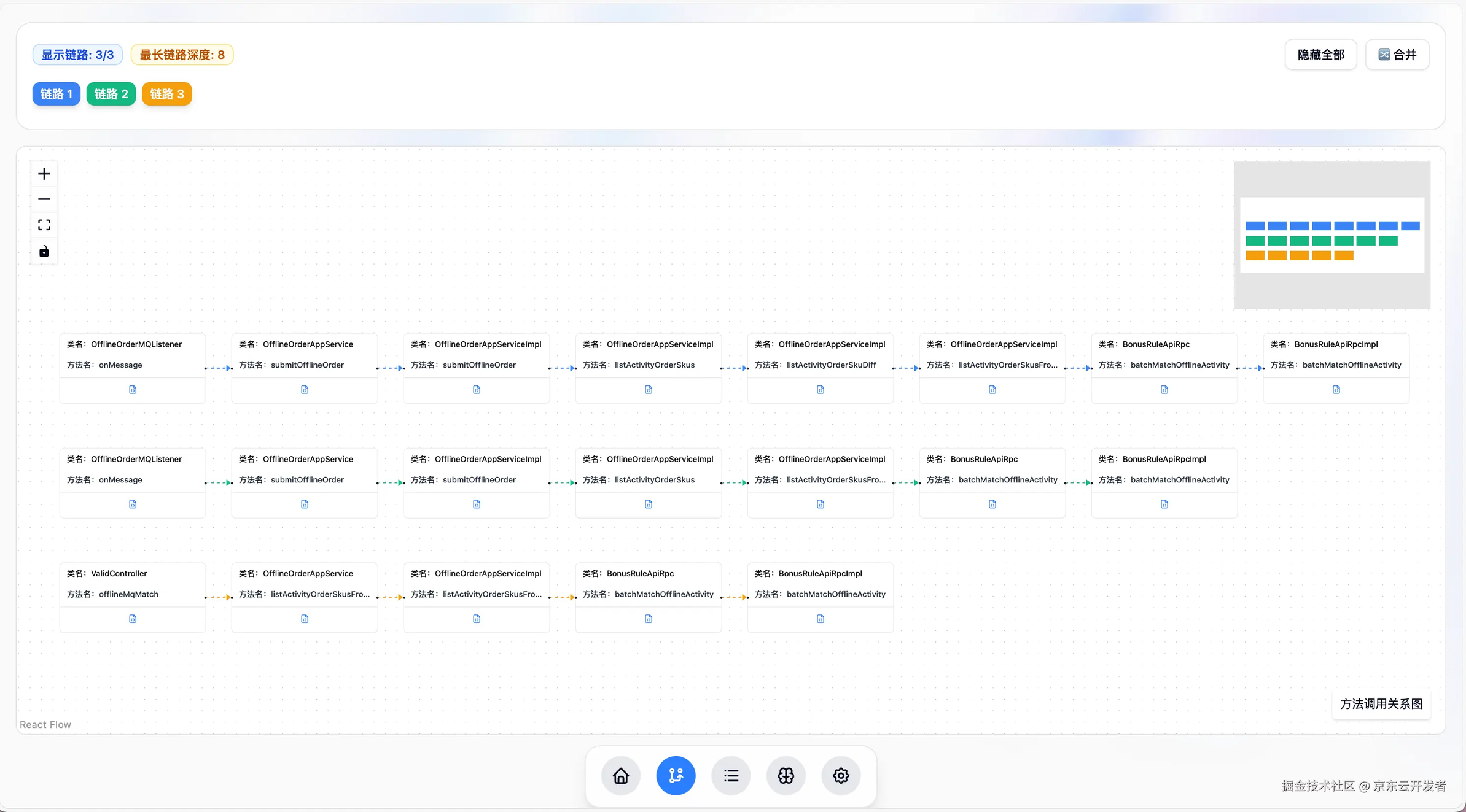 精准链路分析项目,黑马参赛项目,基于 Cursor 从零启动,单人仅用两天便快速构建出功能完整的精美 Demo。项目完整实现了基于 React Flow 的 JAVA 调用链路展示与组合、AI 流式报告及智能 Agent 对话等多种高级能力。