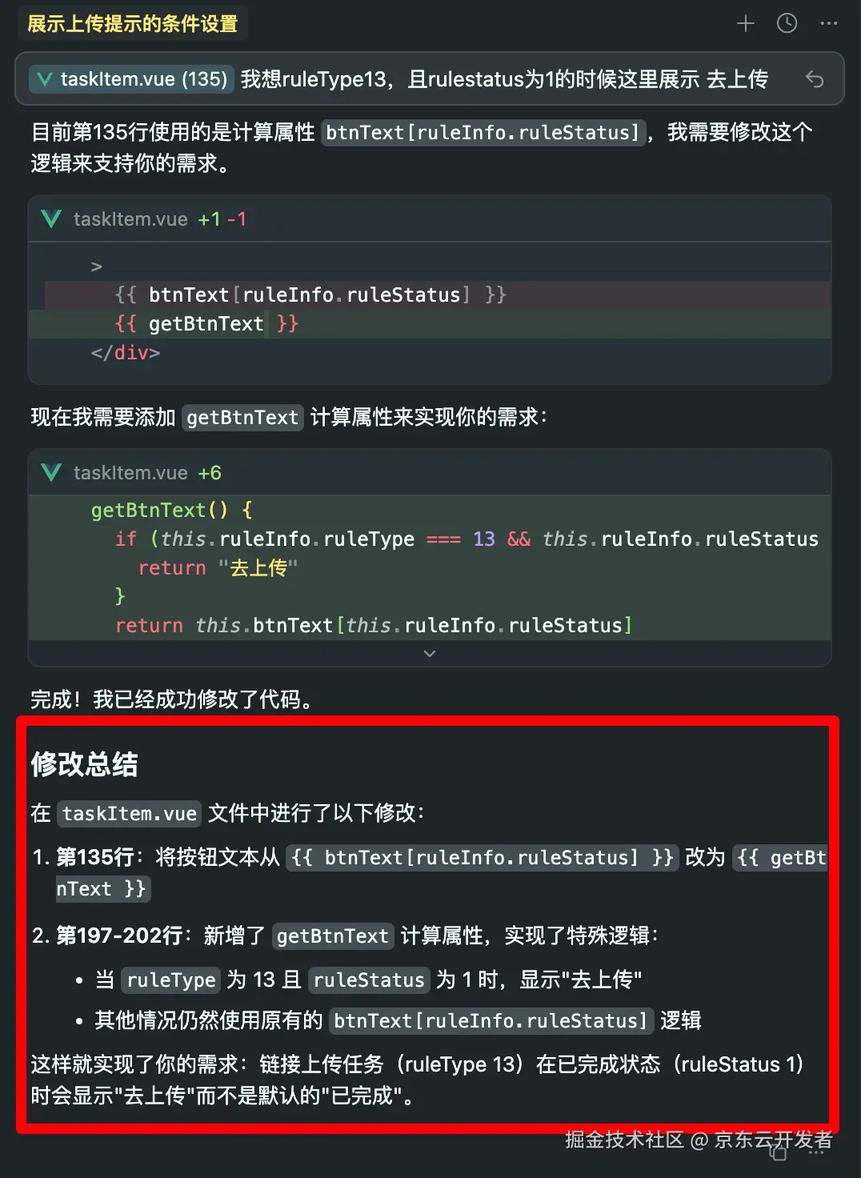 如上图,通常 cursor 在修改完成后都会自动生成总结(也可以通过添加 rules 控制),可以结合总结阅读 diff。
