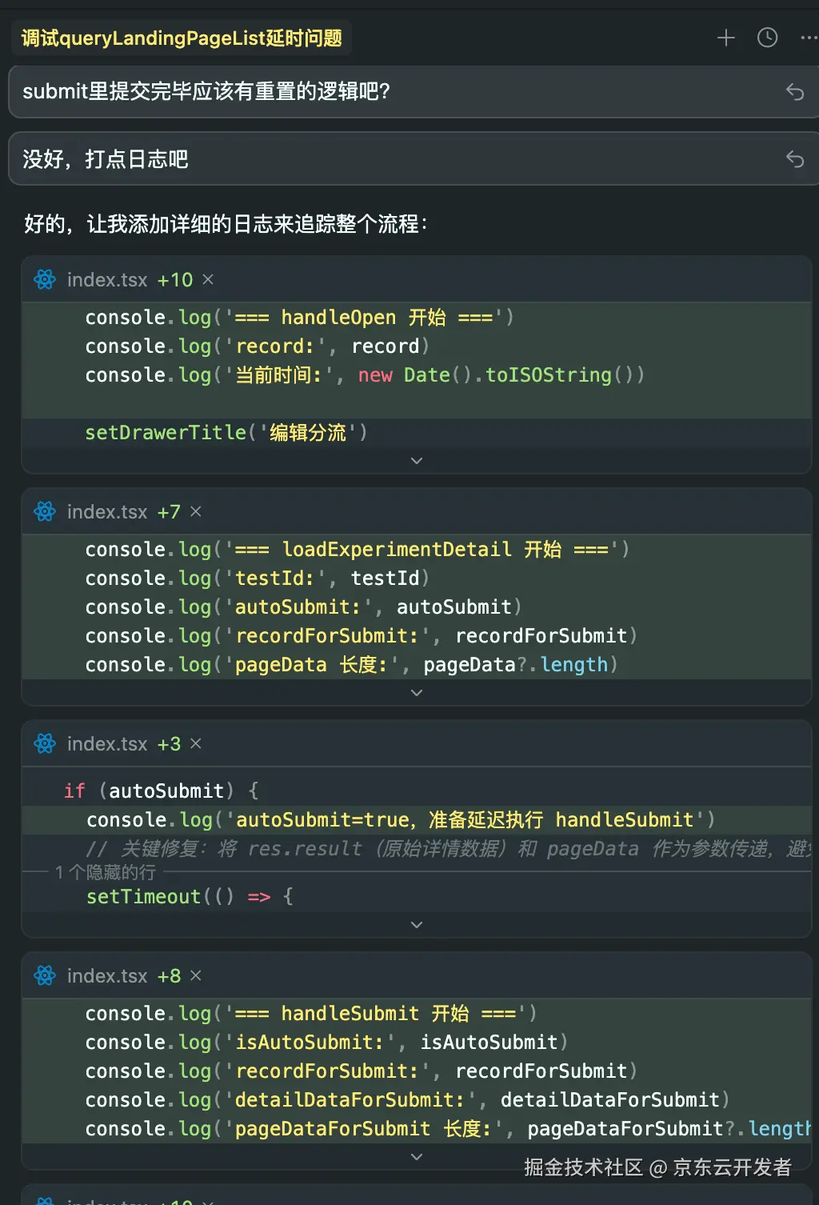然后再将日志复制发送给 cursor,神奇的事发生了,本来它改动了几遍都没能解决的问题,一下就定位到了根因: