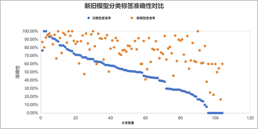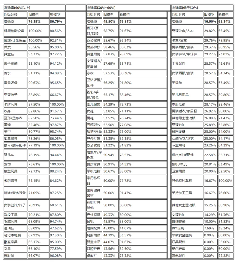 为验证这些发现的稳定性,我们收集了一个月内的 1.1 万条数据进行验证,这些数据包括了各种各样的商品细分品类。在随机抽取的 103 个分类中,约 90.3%(93 个)呈现上升趋势,仅 9.7%(10 个)呈现下降趋势,进一步证实了大型模型在涉及众多商品品类的分类任务中,无须任何提前训练,在绝大部分的分类任务中,表现都优于传统机器学习方法,表现出很好的准确率与稳定性。