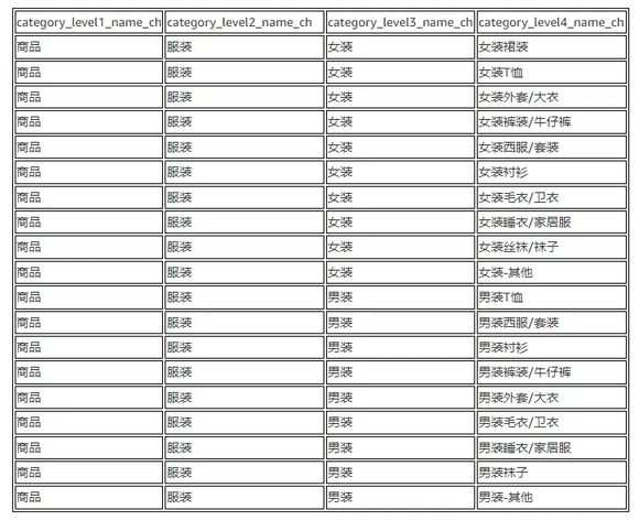 JSON[ { "category_id": "1", "name": "服装", "children": [ { "category_id": "1-1", "name": "女装", "children": [ { "category_id": "1-1-1", "name": "女装裙装" }, { "category_id": "1-1-2", "name": "女装T恤" }, { "category_id": "1-1-3", "name": "女装外套/大衣" }, { "category_id": "1-1-4", "name": "女装裤装/牛仔裤" }, { "category_id": "1-1-5", "name": "女装西服/套装" }, { "category_id": "1-1-6", "name": "女装衬衫" }, { "category_id": "1-1-7", "name": "女装毛衣/卫衣" }, { "category_id": "1-1-8", "name": "女装睡衣/家居服" }, { "category_id": "1-1-9", "name": "女装丝袜/袜子" }, { "category_id": "1-1-10", "name": "女装-其他" } ] }, ...