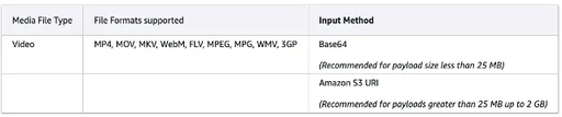 针对视频文件过大(大于 25MB),或者文件已保存在 Amazon S3 中的视频,可直接指定其来源为 S3,无须本地再下载,直接读取 S3 并理解的示例代码如下: