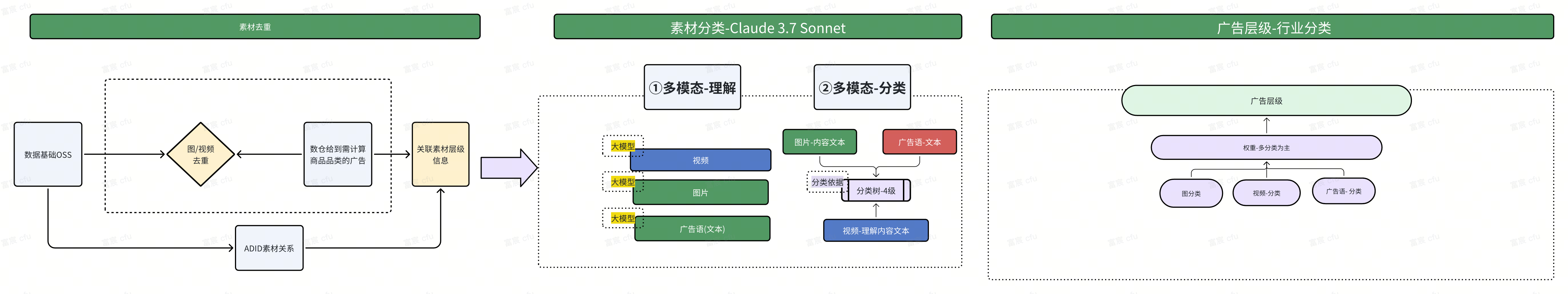 系统对预处理完成的素材进行深度分析,将广告图片内容与相应的广告语文本进行智能关联和联合分析,从而获取更全面的语义理解。随后,这些关联数据通过标”四级分类模型”的精细化处理流程,层层递进地进行类别划分和特征提取,最终生成详尽的视频理解内容文本,完成对广告素材的全方位分类标注 ,为后续的精准投放奠定数据基础。