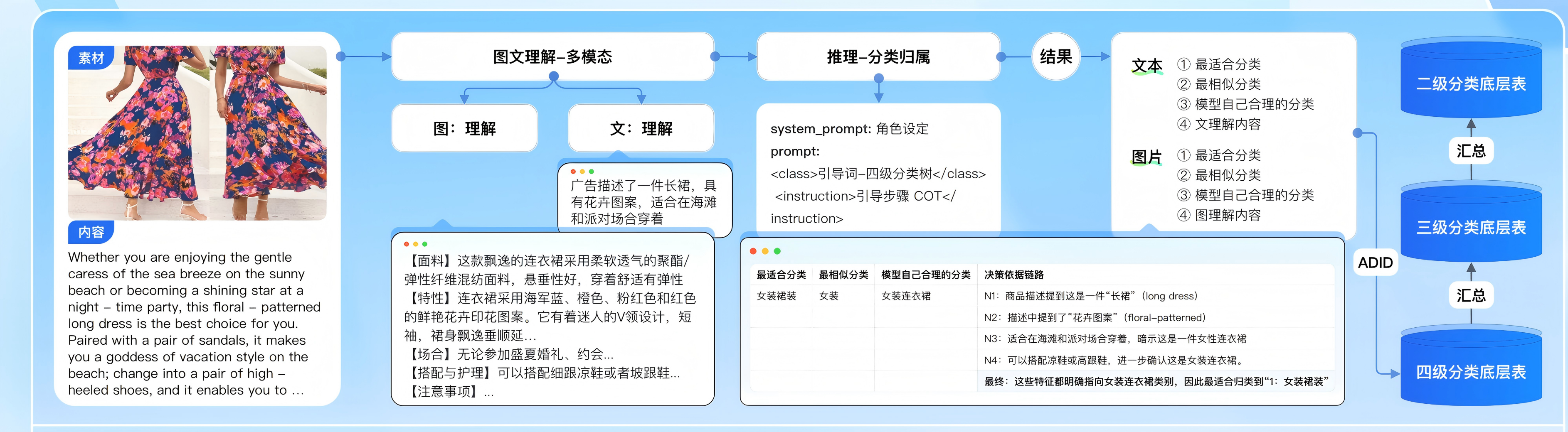 而广告素材来源于不同的广告客户,有着不同的类型与风格。广告素材由于投放的渠道,投放的展示位置不同,有着不同的类型和尺寸大小。为了方便下游业务系统进行分析,需要对这些不同的广告素材进行统一处理,因此需要引入统一的分类类目,然后使用多模态模型对广告素材进行处理,归类到统一的分类类目中。