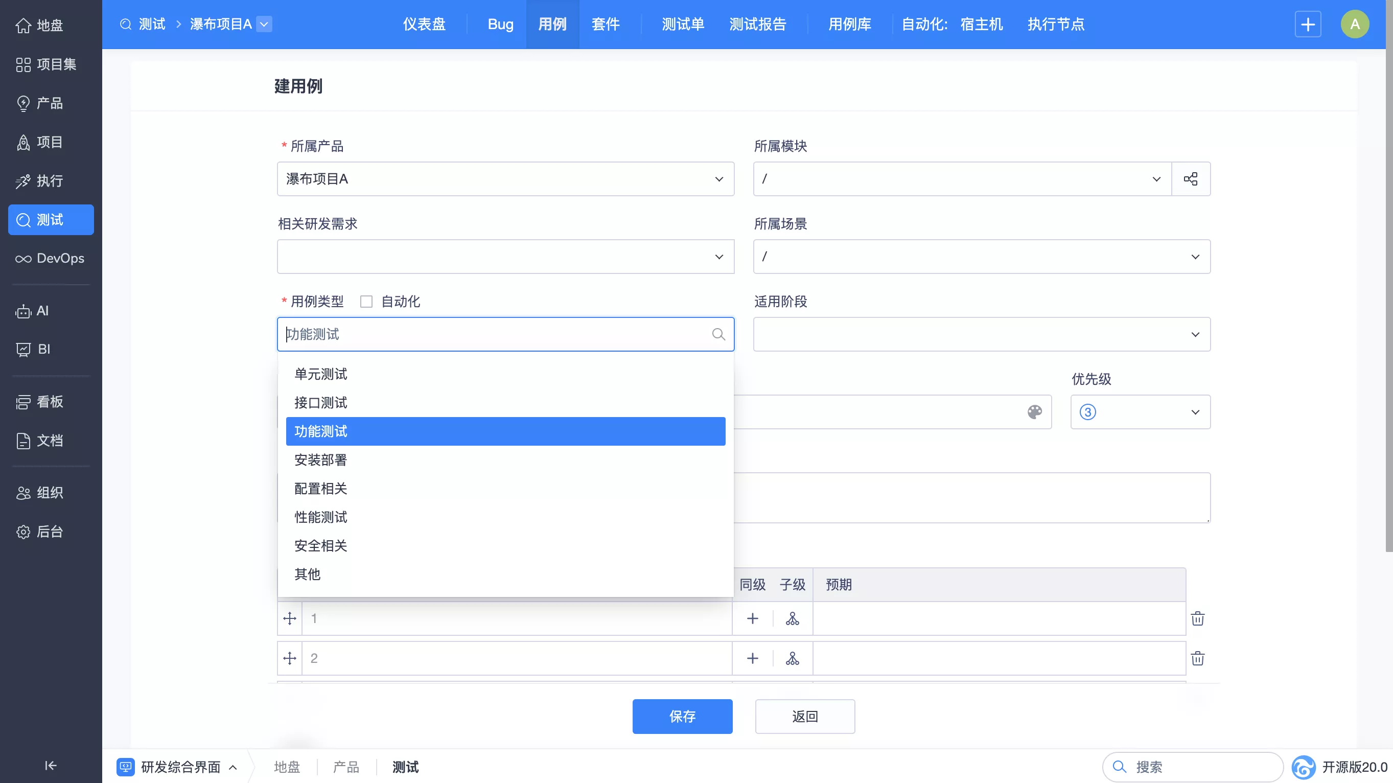 在禅道中,测试人员可以在“测试-用例”下,根据研发需求编写测试用例。在建用例页面,可选择相应的产品、需求模块、用例类型、适用阶段、相关研发需求等。