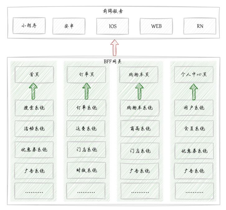 BFF 是近些年新衍生出来的一种开发模式,或者说是一种适配模式的系统,BFF 全称为 Backend OF Front 意为后端的前端,为了适配微服务模式下前端后端系统接口调用混乱而出现的。在如今微服务盛行的趋势下,大型系统中划分出了数十个服务模块,例如商品,门店,运费,红包,订单,优惠券,CMS,用户,搜索,推荐,广告等等系统,前端也有小程序,APP,网页等端。由此产生了很多问题:
