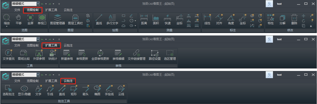 3. 新建图纸后,在菜单栏中点击切换至【览图绘制】、【扩展工具】或【云批注】选项卡,根据实际需求调用各项功能,即可进行一些简单的绘图工作。如下图所示: