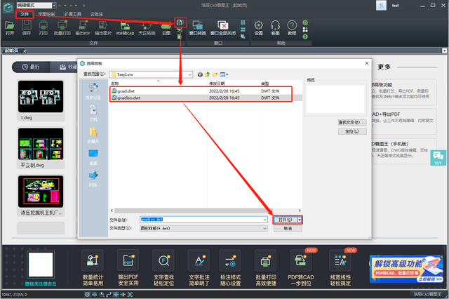 (1)在菜单栏中点击切换至【文件】选项卡,点击【+】新建图纸按钮,会弹出【选择样板】对话框中,选择文件类型,点击【打开】按钮。如下图所示: