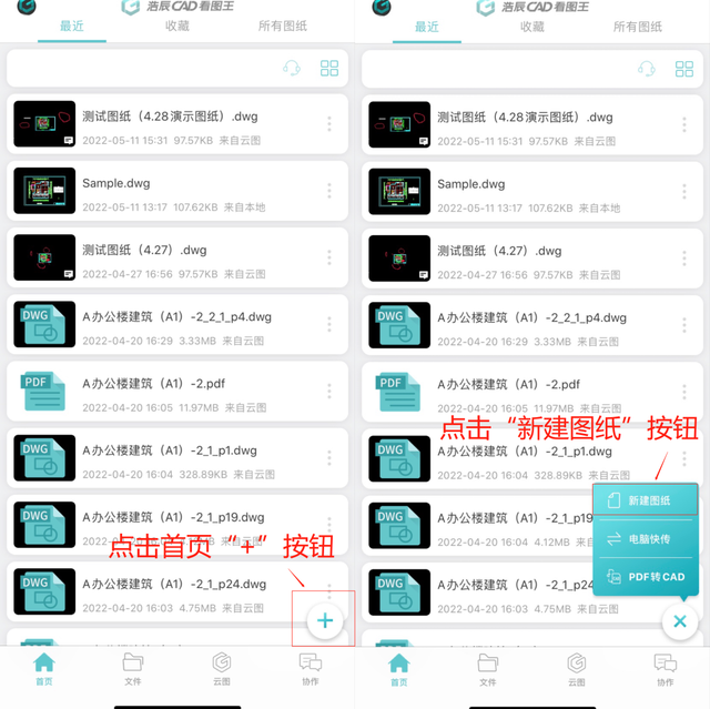 1. 在手机中打开浩辰 CAD 看图王 APP,点击右下角【+】按钮,在弹出的对话框中点击【新建图纸】。如下图所示: