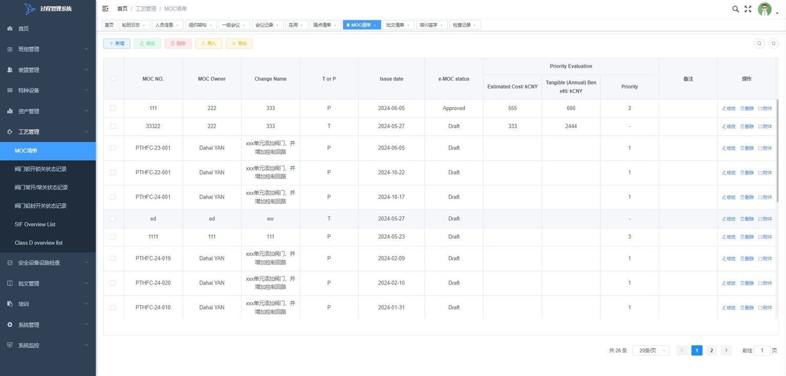 MOC 清单:管理变更控制(MOC)的清单,包括变更的申请、审批和实施状态,以确保变更的合规性和安全性。